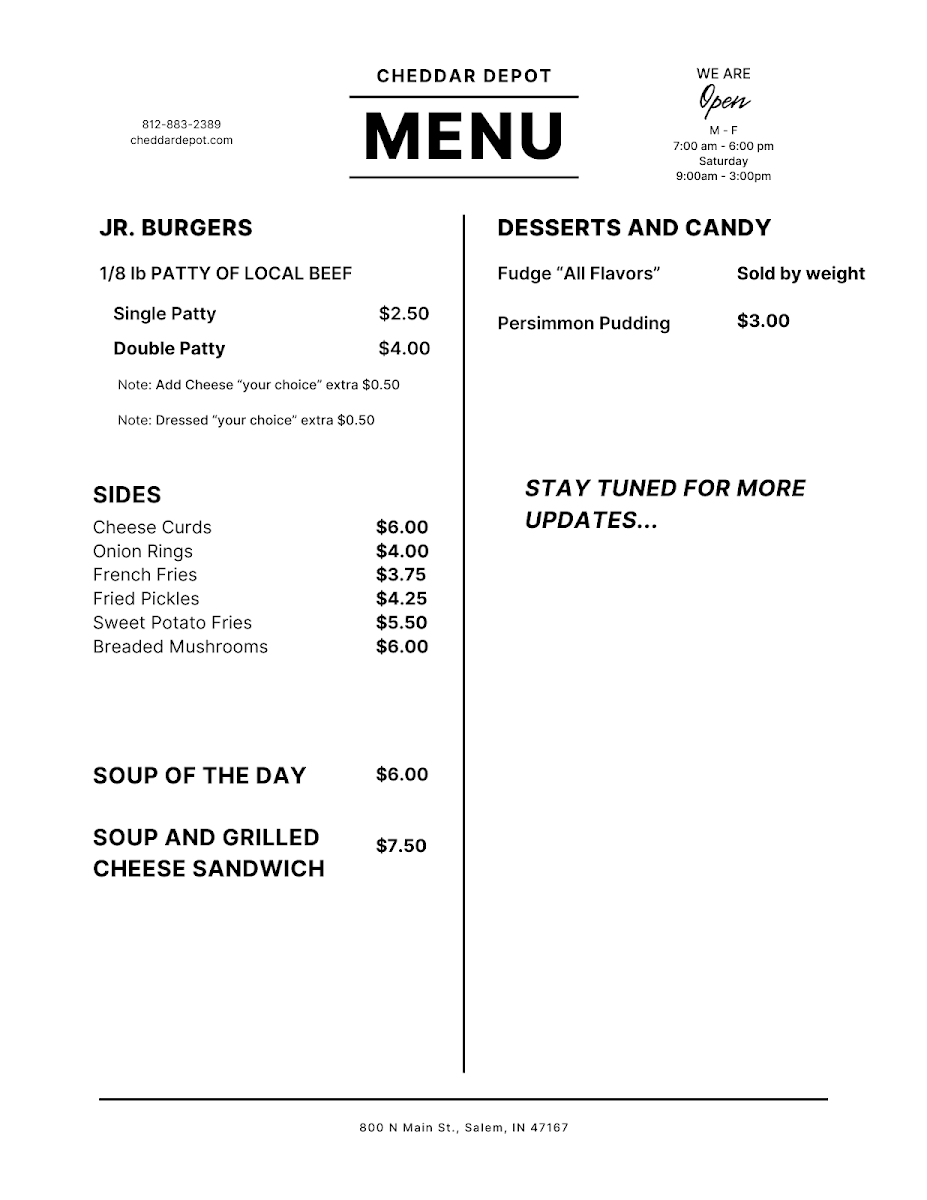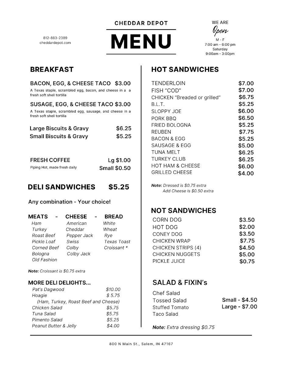 Welcome to Cheddar Depot, a charming eatery nestled at 800 N Main St, Salem, IN. This quaint spot offers a delightful menu that truly captures the essence of comfort food. Start with their Chef Salad for just $4.50 or indulge in a hearty Taco Salad. For those craving something crispy, their sides like Cheese Curds and Fried Pickles are must-tries!